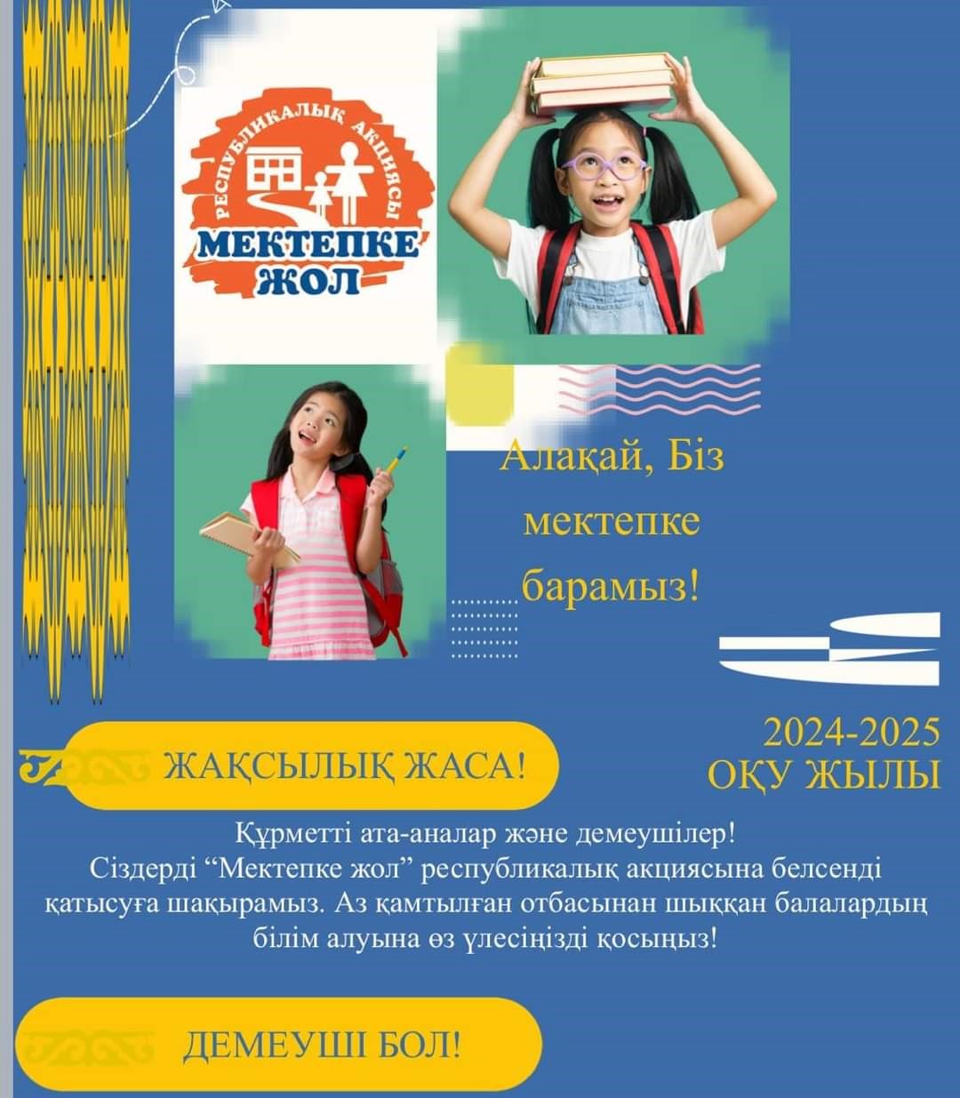 Құрметті Түркістан облысы, Жетісай ауданы, Жетісай қаласының жаны жайсаң, жомарт жандары! "Жетісай ауданының мамандандырылған "Дарын" мектеп - интернаты" 2024 жылдың 1 тамызы мен 30 қыркүйек аралығында «Мектепке жол» Республикалық акциясы өткізілетінін хабарлайды. Республикалық акцияның мақсаты - аз қамтылған, көп балалы отбасындағы балалар және жетім балалар мен ата - анасының қамқорлығынсыз қалған балаларға оқу жылының басталуына дайындық кезінде материалдық көмек көрсету болып табылады. Аталған акция Министрліктің бастамасымен «Мектепке жол - Шекарасыз жақсылық» ұранымен өткізілуде. Қазақстан Республикасының әрбір азаматы халықтың әлеуметтік осал топтарынан шыққан балаларды мектепке дайындауда атаулы көмек көрсетуде азаматтық белсенділік таныта алады, оның мектепке жолы қуанышты болуы үшін әрбір балаға шынайы қамқорлық пен назар аудара алады. Осыған орай, ауданымыздың барлық азаматтарын, бизнес - құрылымдарын, үкіметтік емес ұйымдарды және жеке кәсіпкерлерді, мемлекеттік органдарды аталған акцияға, жоғарыда көрсетілген санаттағы отбасы мен балаларға көмек көрсетуге шақырамыз. "Қолы ашықтың жолы ашық" демекші, жақсылық жасап жарысайық! "Мектепке жол" акциясы 30 қыркүйекке дейін жалғасады. Мекен жайымыз: «Жетісай ауданының мамандандырылған «Дарын» мектеп - интернаты» коммуналдық мемелекеттік мекемесі мектеп әкімшілігі. Байланыс нөмірі: 87077070083, 87478613275