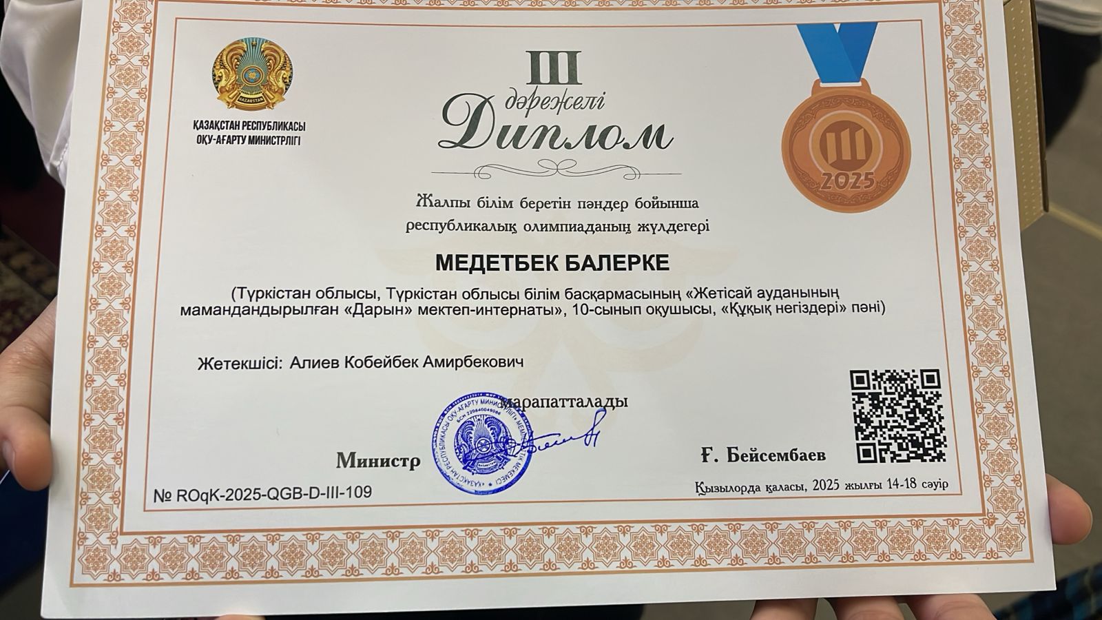 Медетбек Балерке, құқық негіздері ,10- сынып- 3-орын( жетекшісі К. Алиев).