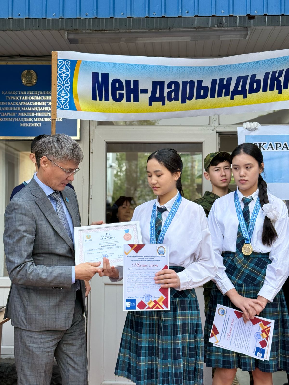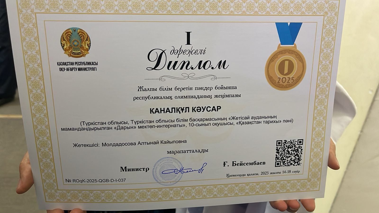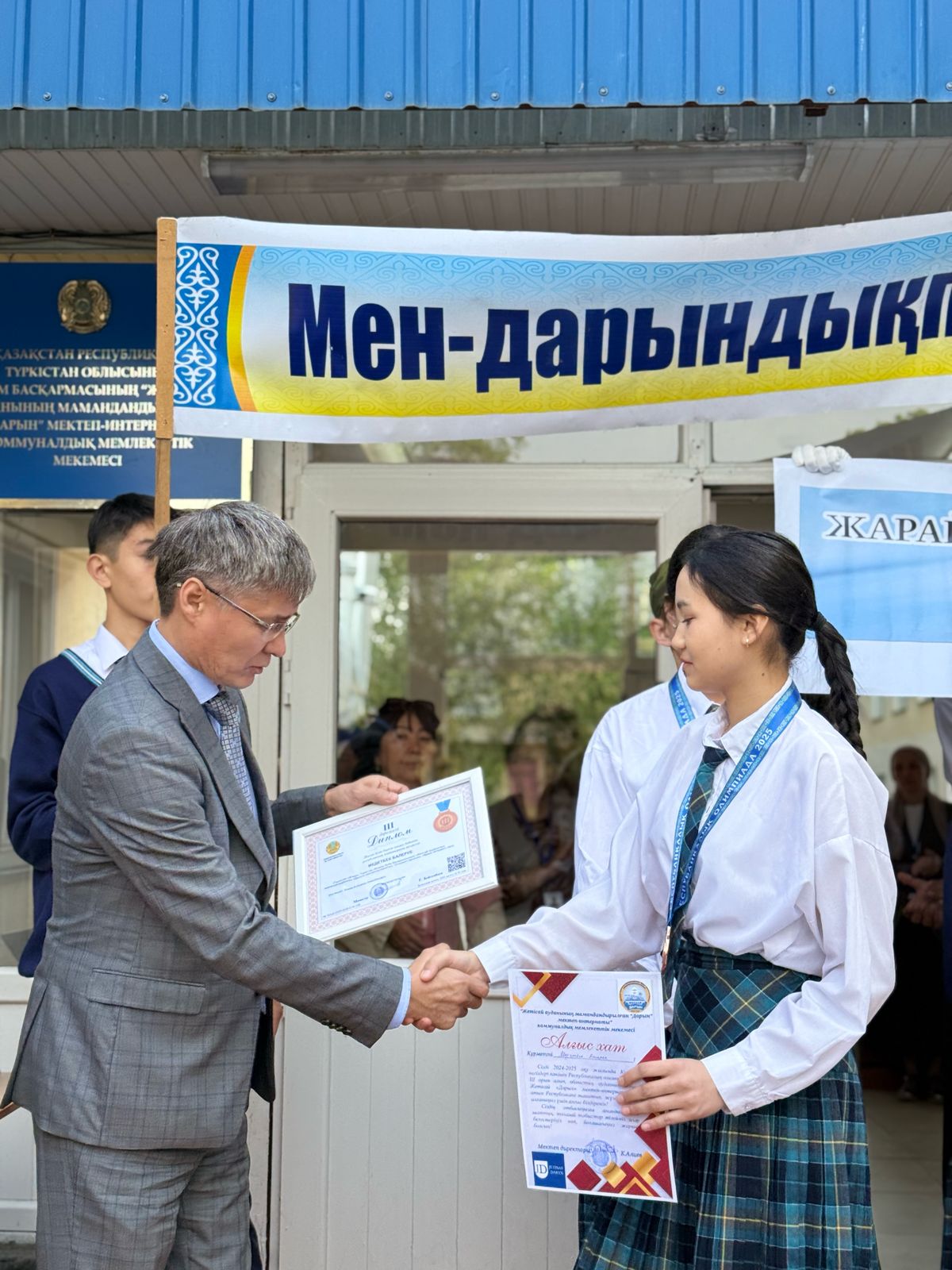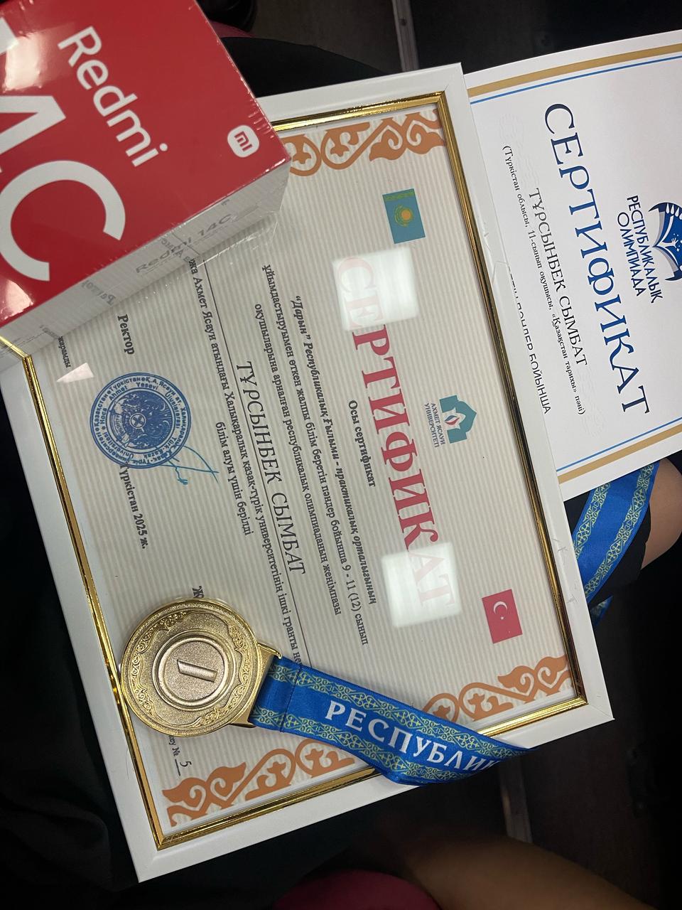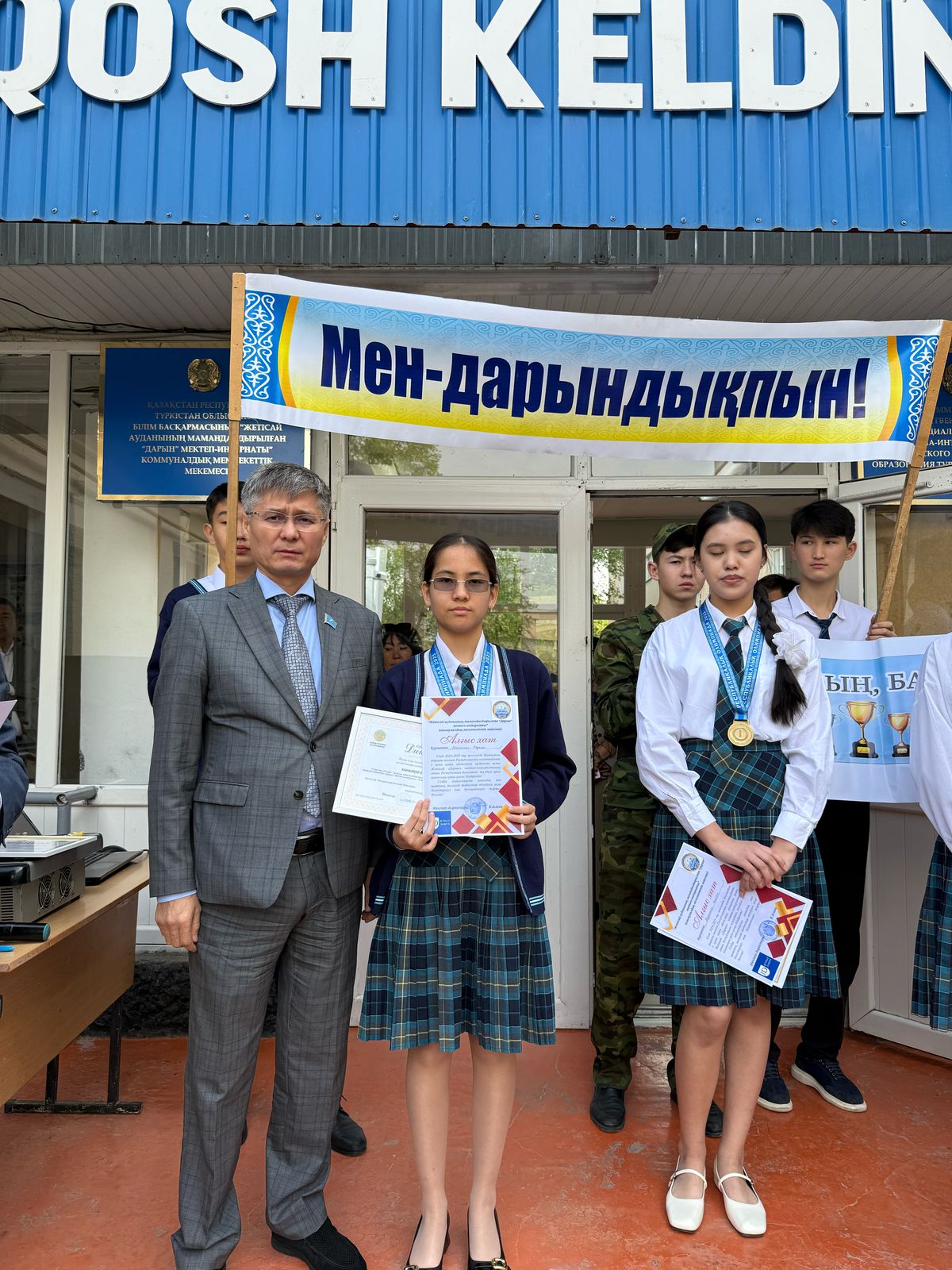 2025 жыл 25 ақпан күні Түркістан қаласында 9 - 11 - сынып оқушыларына арналған республикалық “Абайтану” олимпиадасының облыстық кезеңі болып өтті. Осы олимпиадаға мектебіміздің атынан қатысқан оқушыларымыз- Оңғарбай Дариға 1 - орын иегері атанса, Худайберген Назерке 3 - орын иегері атанып, мектеп мерейін үстем етті. Жарайсыңдар, жеңіс құтты болсын дейміз!