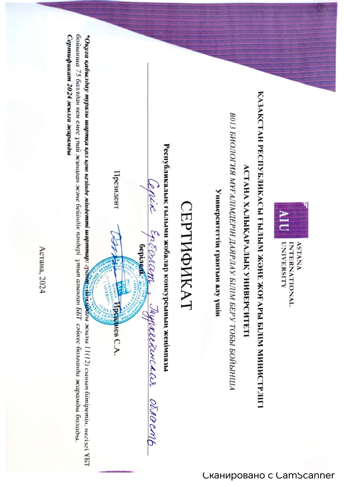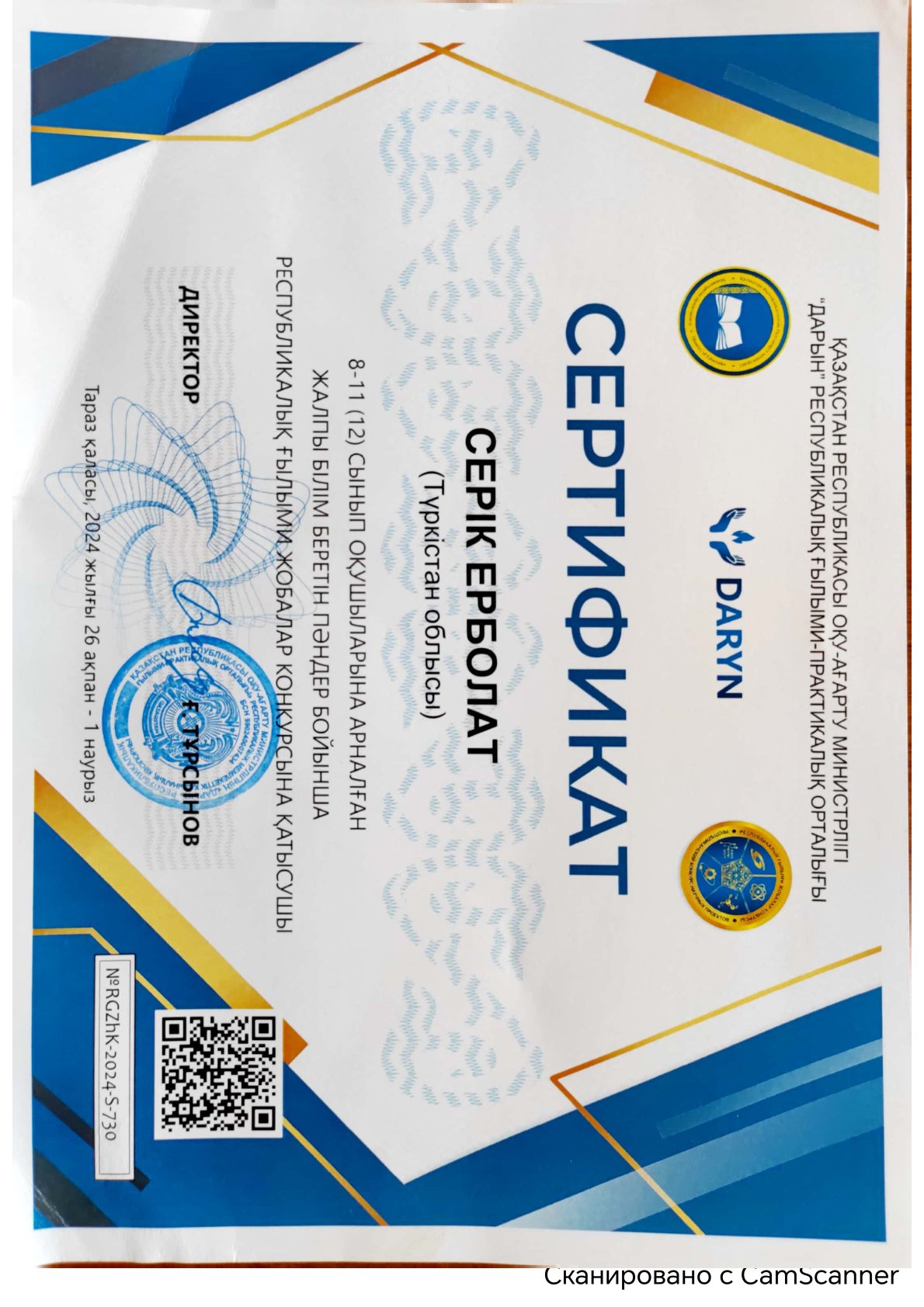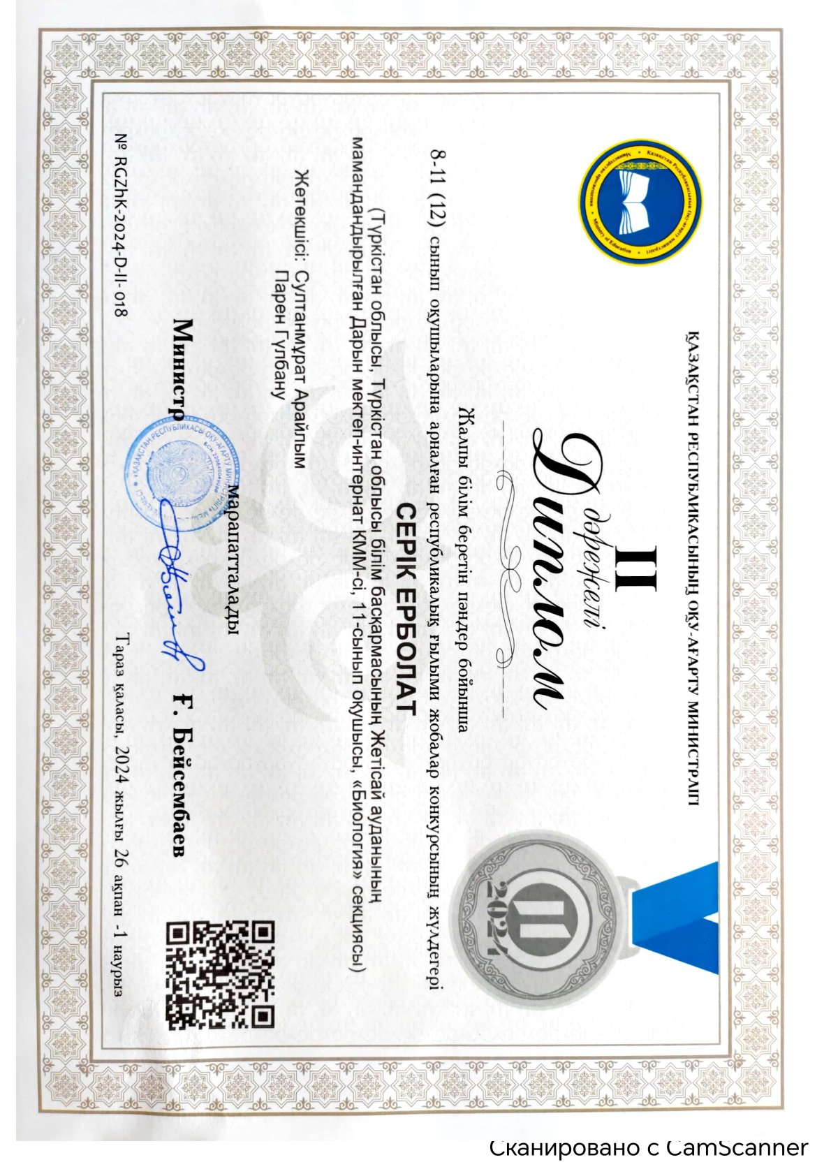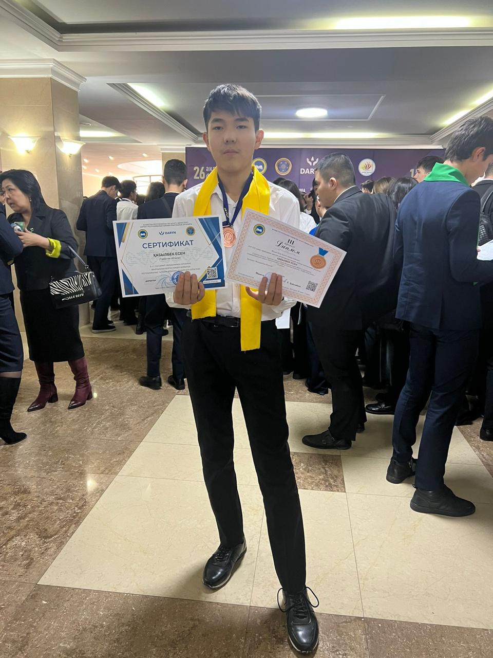 Серік Ерболат, биология секциясы 2 - орын ( жетекшілері Парен Гүлбану, Сұлтанмұрат Арайлым, Ізбасар Ақмаржан, а.ш.ғ.к., доцент Дошманов Ескендір Қиятович, биология ғылым магистрі Н. Нурмаганбетов);