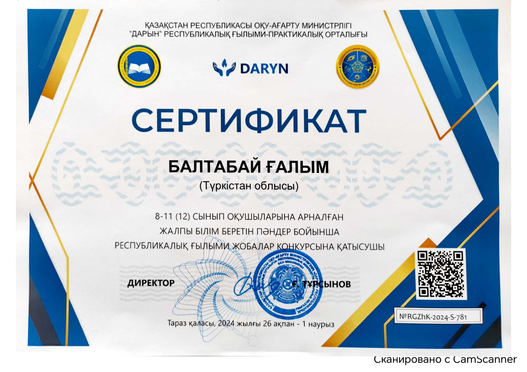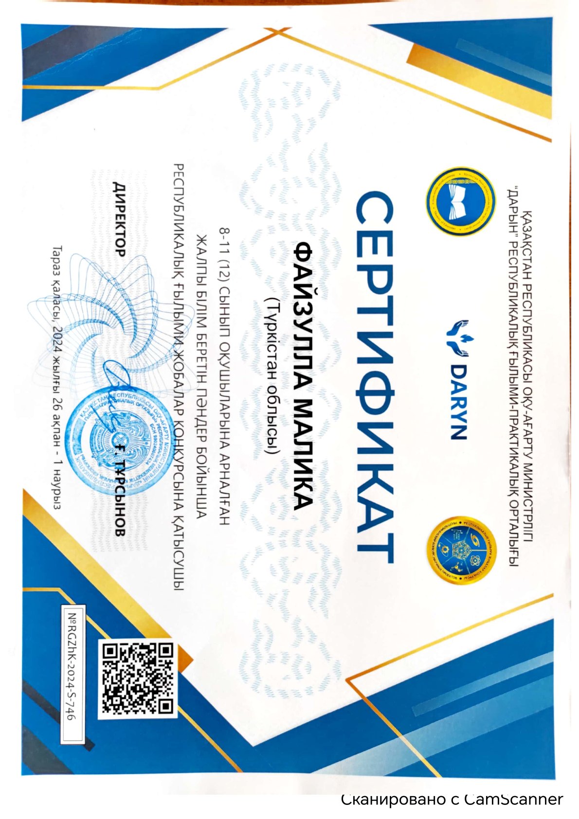 Каналқұл Каусар , Қазақстан тарихы,10- сынып- 1-орын( жетекшісі А.Молдадосова);