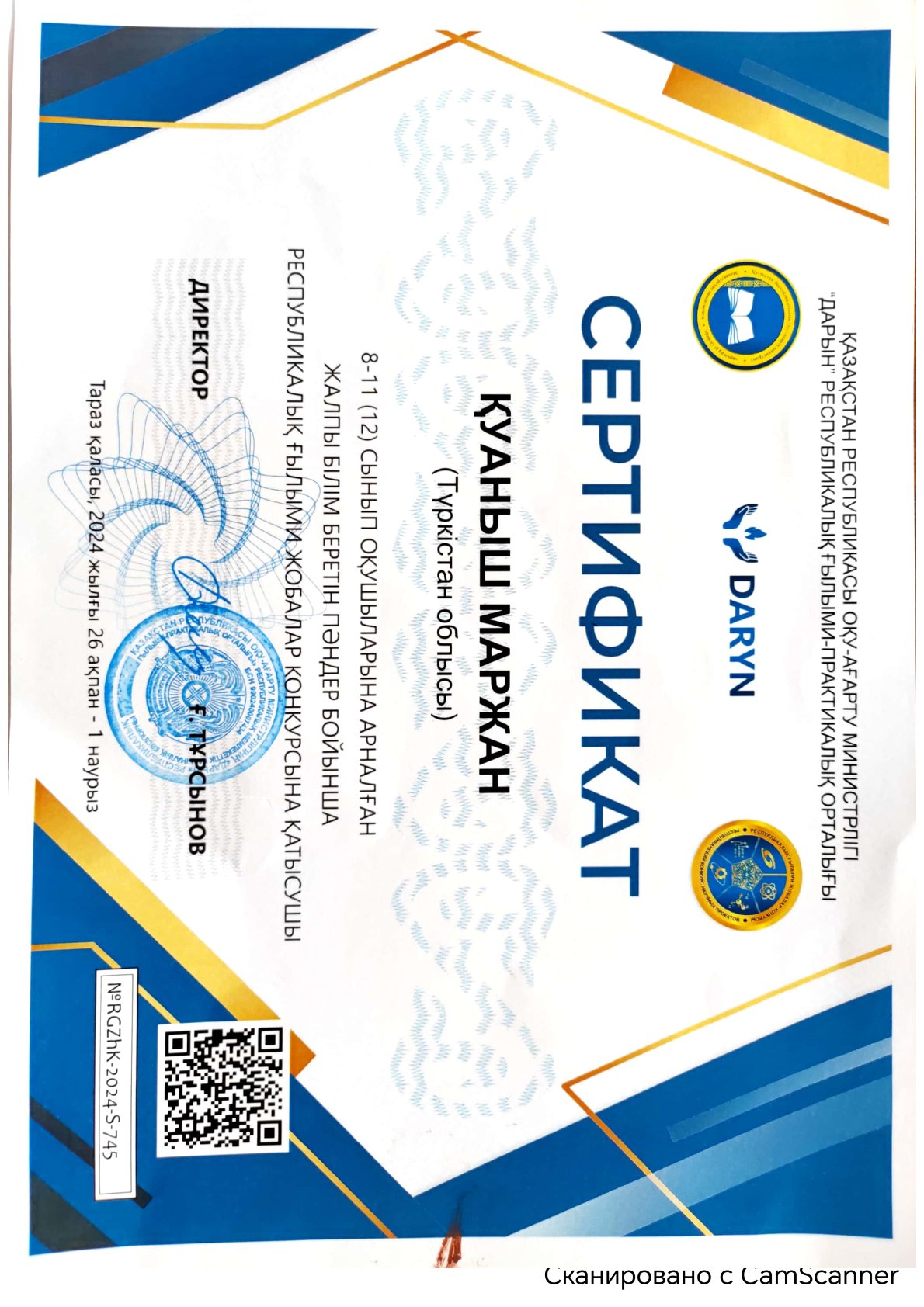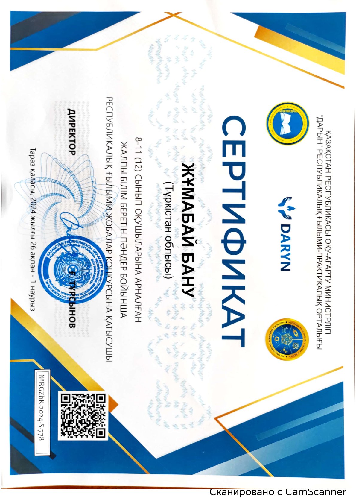 2024 жылдың 26 ақпан - 1 наурыз күндері аралығында Тараз қаласында жалпы білім беретін пәндер бойынша ғылыми жобалар конкурсының республикалық кезеңі болып өтті.