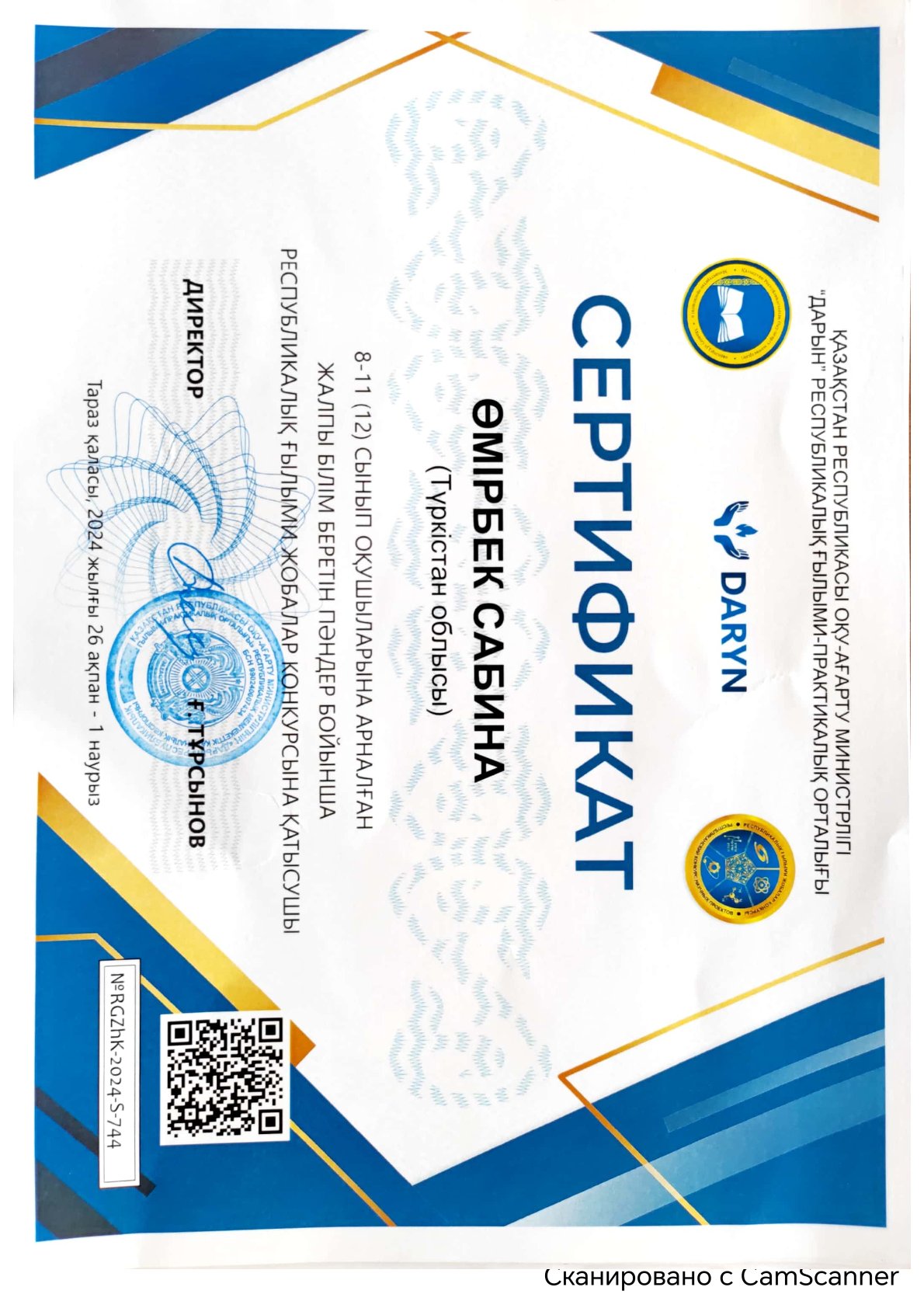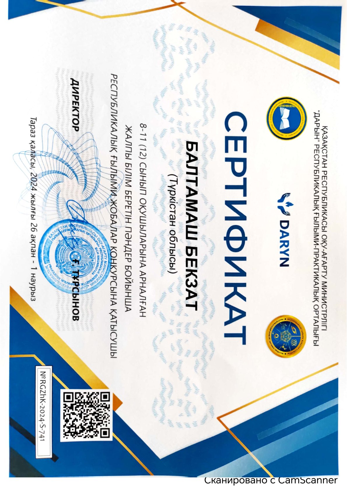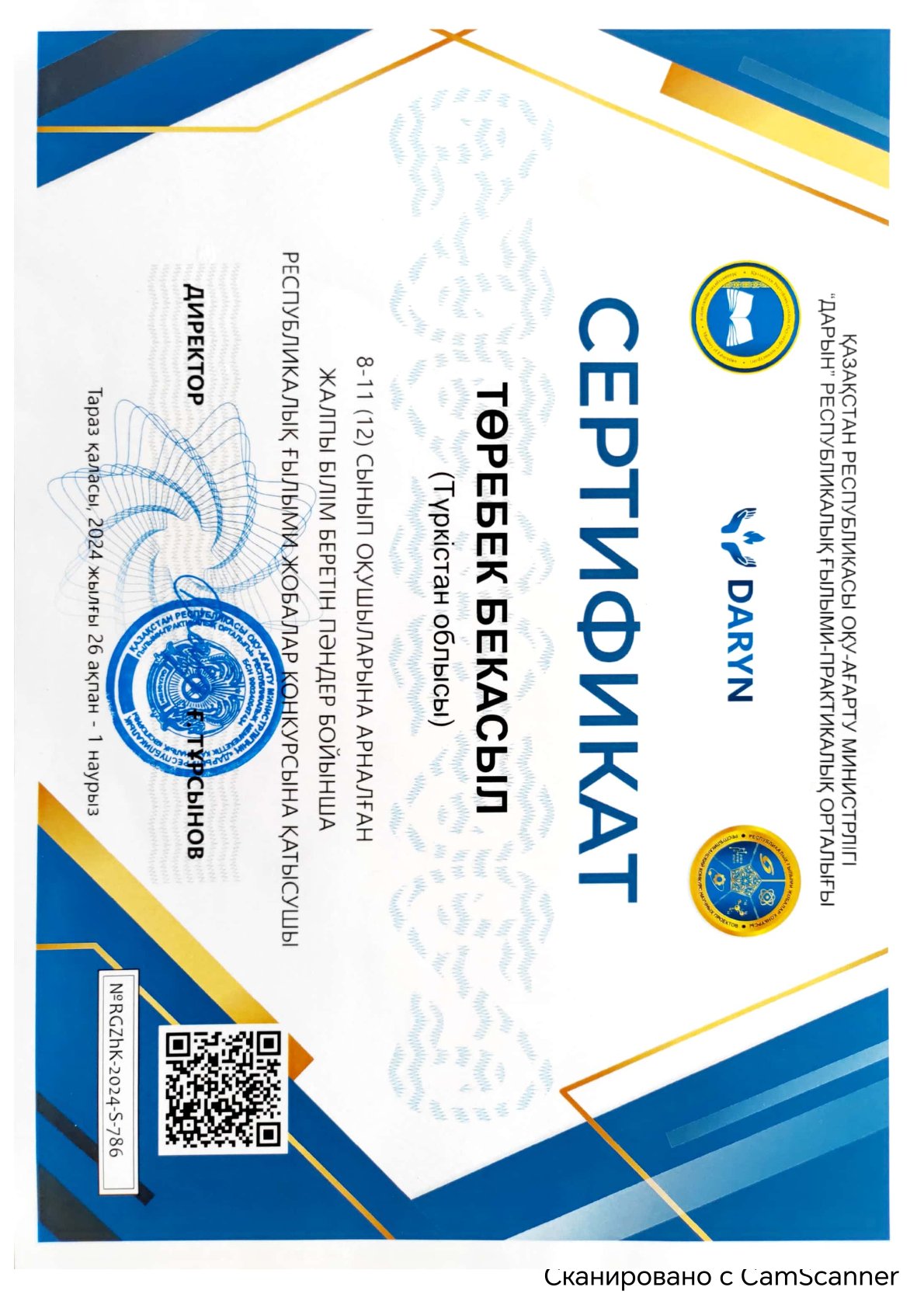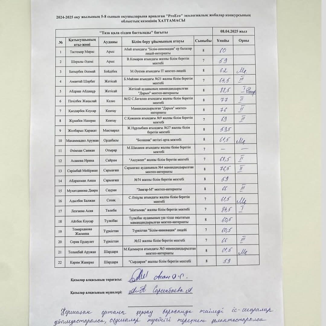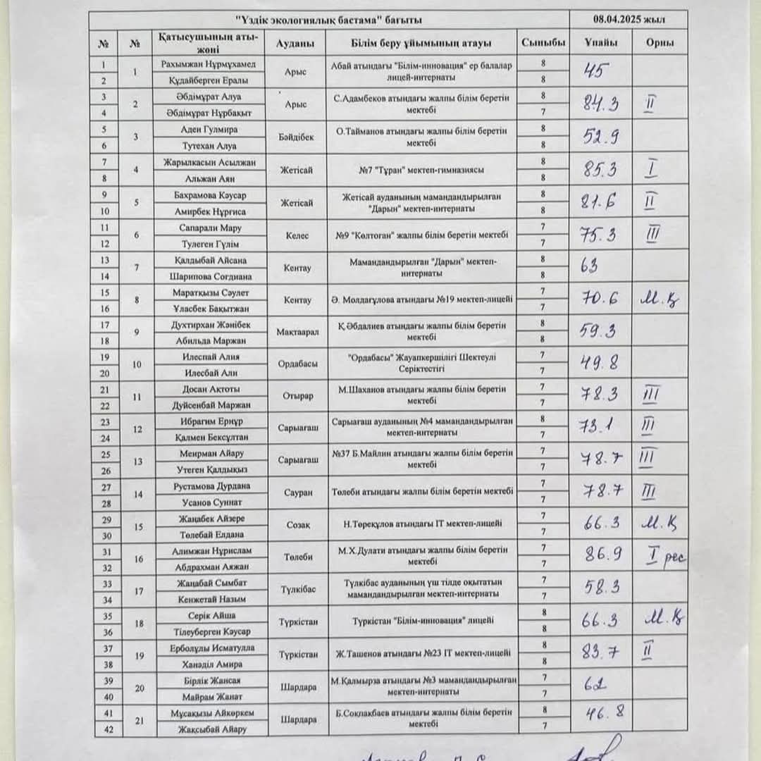 Бүгін 2025 жылдың 8 сәуір күні Түркістан облысы білім басқармасының «Облыстық дарынды балаларды анықтау және қолдау орталығының» ұйымдастыруымен Түркістан қаласы, «№33 жалпы білім беретін мектебі» коммуналдық мемлекеттік мекемесінде өткізілді. “ Кіл жүйрікте кім жүйрік ?“ демекші, “ Таза қала сізден басталады” бағыты бойынша 8- сынып оқушысы Абдираш Абдинур жүлделі 1- орын иеленіп, республикалық кезеңге жолдама алса, Әмірбек Нурғиса , Бахрамова Каусар “ Үздік экологиялық бастама “ секциясы бойынша 2- орын иегері атанды!Жарайсыңдар, кішкентай ғалымдар!
