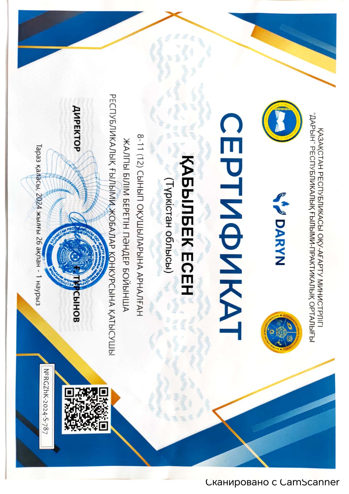 Қабылбек Есен, Төребек Бекасыл , Адам және қоғам секциясы, 3 - орын( жетекшісі Молдадосова Алтынай, кеңесші Алиев Көбейбек Әмірбекұлы) және техника секциясы бойынша Балтамаш Бекзат, Гуламидин Аружан, Ілесбек Саят, Өтеген Маржан сынды шәкірттеріміз “ Алғыс хат” иегерлері атанды.( Жетекшілері Жусипханов Ақжол, Алиманов Олжас).