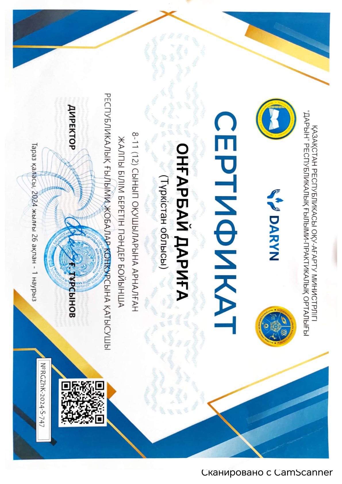 Жалпы білім беретін пәндер бойынша 9-11 сынып оқушыларына арналған қоғамдық- гуманитарлық бағыттағы пән олимпиадасының республикалық кезеңі Қызылорда қаласында 14-18 сәуір аралығында “Дарын” РҒПО ұйымдастыруымен өтілді. Білім бәйгесіне Түркістан облысының атынан қатысқан