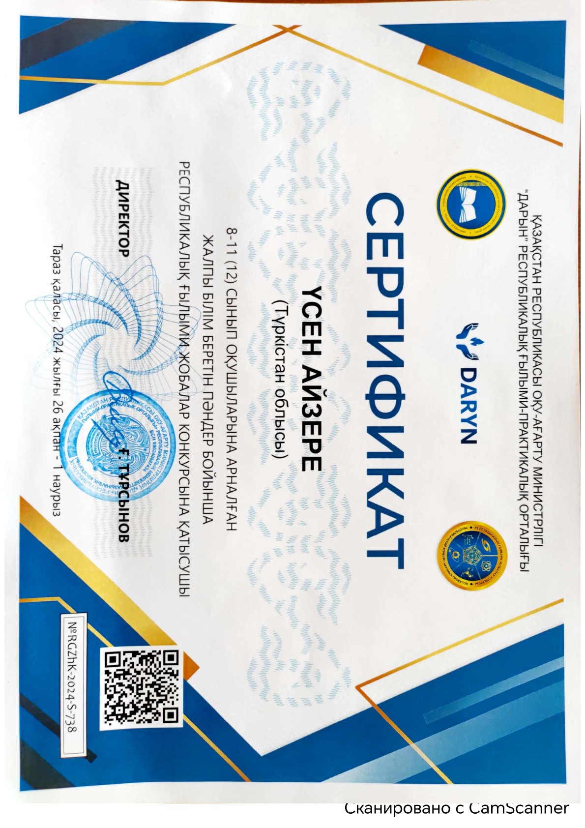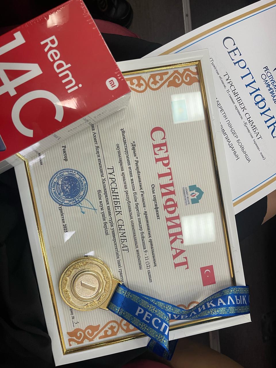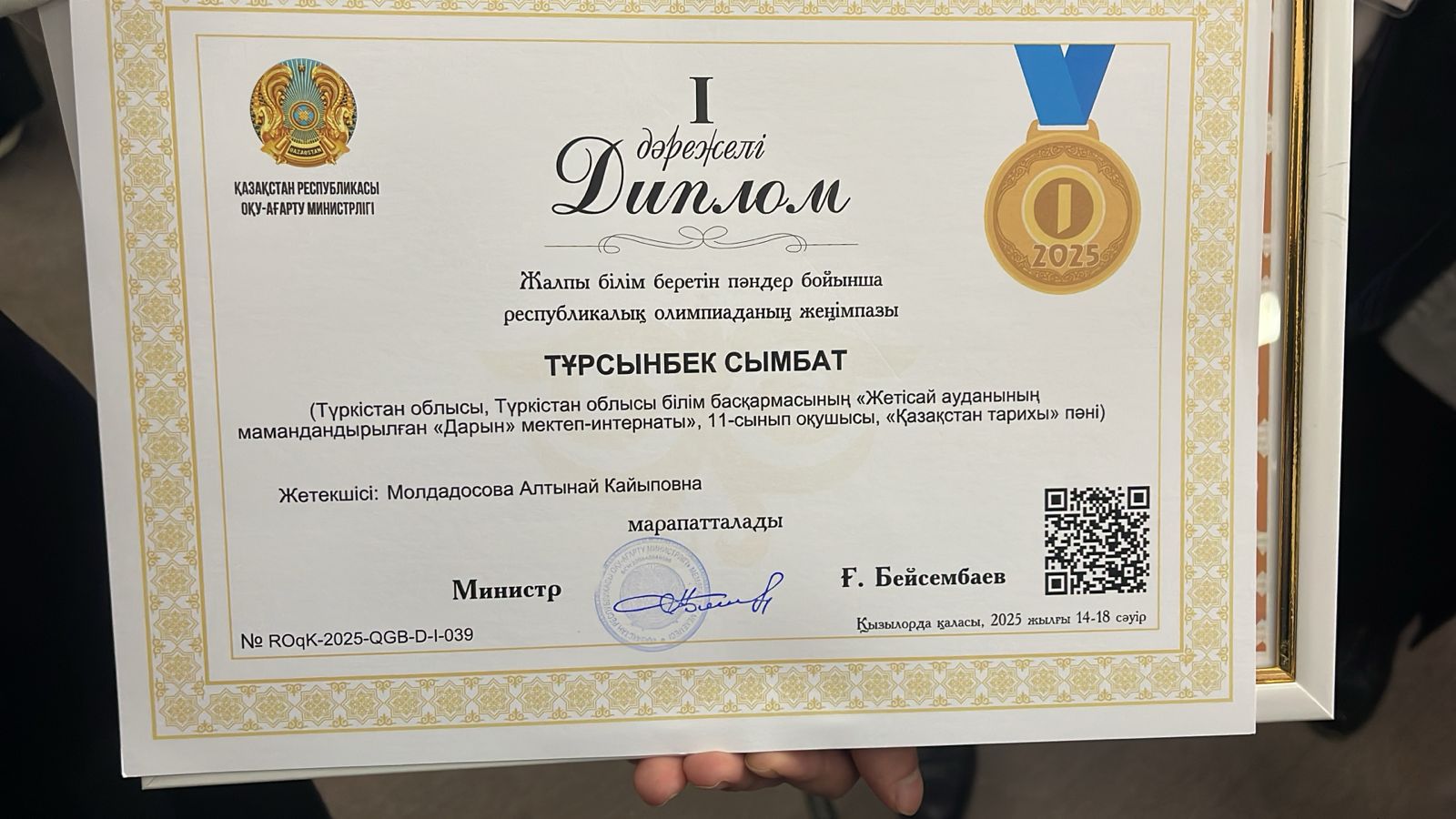 Тұрсынбек Сымбат Қазақстан тарихы,11- сынып - 1-орын, Халықаралық қазақ- түрік университетінің гранты(жетекшісі А.Молдадосова),