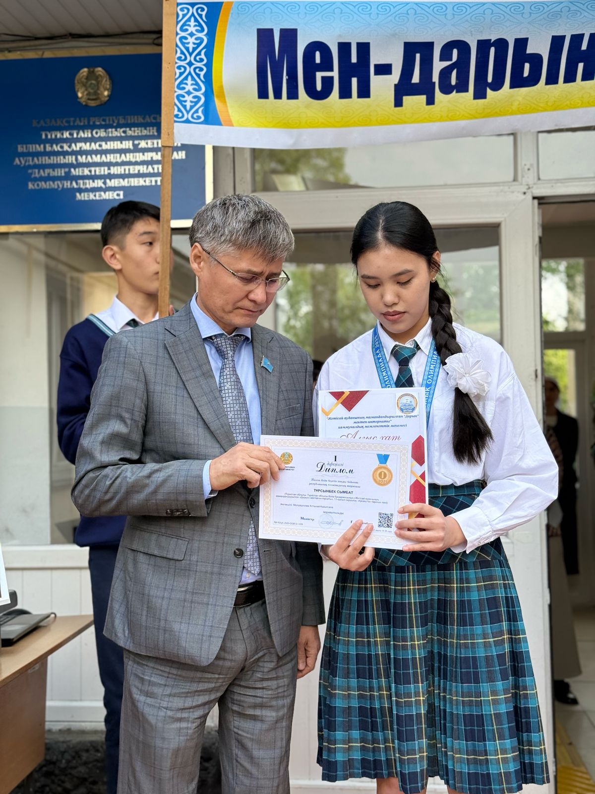 2024ж 24 қазан күні Түркістан төрінде өткен шығармашыл оқушылар арасындағы республикалық «Ақберен» өнер байқауының облыстық кезеңінде «Жетісай ауданының мамандандырылған «Дарын» мектеп-интернаты» КММ-нің 3 оқушысы жеңіс тұғырынан көрінді. Худайберген Назерке – 2-орын «Шешендік , білгірлік сайысы» бойынша; Тұрсынбек Сымбат – 3-орын «Эссе жазу» бойынша; Баржақсы Сәбина -мақтау қағазы «Ұлттық аспапта өнер көрсету». Жеңімпаз шәкірттерді құттықтаймыз! «Бүгінгі күн – кешегінің жемісі, ертеңгінің болмысы» , -дейді дана халқымыз. Жетекшілік еткен әріптестеріміз Султанова Минара Қойайдарққызы, Зулпиева Құттықыз Өмірзаққызына алғыс білдіреміз! Әр ұстаздың ұрпақ тәрбиелеу жолындағы қажырлы әрі адал еңбектері еселене берсін!