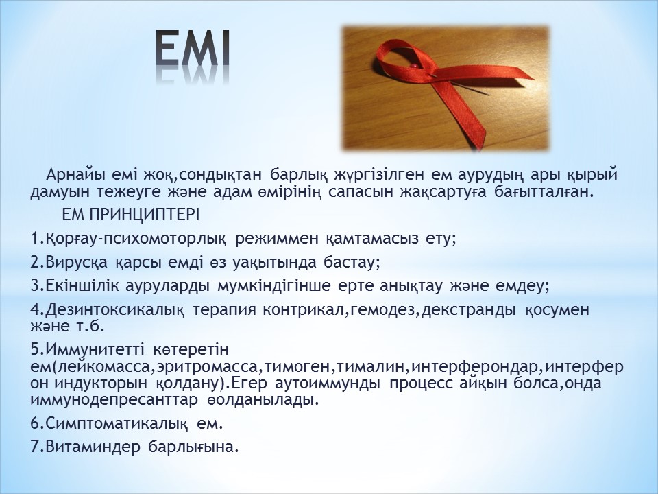 Жетісай каласы Өтілген мерзімі: 23.11.2022ж. сағ:16 00 Өтілген орны: Мәжіліс залы Қатысқандар: 7-11 сынып оқушылары. 1.«Жетісай ауданының мамандандырылған «Дарын» мектеп-интернаты» коммуналдық мемлекеттік мекемесінің директордың тәрбие ісі жөніндегі орынбасары Н.Нұрмағанбетов 2. Түркістан облыстық ҚДБ-нің "Облыстық ЖИТС-тің алдын алу және онымен күресу орталығы"МКҚК Жетісай қаласы бөлімшесінің психолог маманы Шырынкүл Оразханқызы Дукенова 3.Түркістан облыстық ҚДБ-нің "Облыстық ЖИТС-тің алдын алу және онымен күресу орталығы"МКҚК Жетісай қаласы бөлімшесінің эпидемиолог көмекшісі Мухамматали Мутанович Бабашев 4.«Жетісай ауданының мамандандырылған «Дарын» мектеп-интернаты» коммуналдық мемлекеттік мекемесінің педиатр врач Тажен Гүлназ Әбдірқызы 5. Мейрбике Шериева Гулзат Турдыбаевна 6. Интернат меңгерушісі Адилбекова Айнұр Сайфудиновна 7.Әлеуметтік педагог: Байбосынова Лаззат Абдиманаповна 8. Педагог психолог Рахимова Бибігүл Сапаровна Күн тәртібінде: 1.АИТВ/ЖИТС жұқпасының алдын алу іс-шарасы, этиология, патогенез, клиника, жұғу жолдары туралы жалпы түсінік; 2.АИТВ/ЖИТС бойынша негізгі ғылыми мәліметтер; 3. АИТВ-нің әлем және Қазақстан бойынша таралуы, эпедемиология жағдайы туралы; 4.Салауатты өмір салтын дұрыс ұстануы. Тыңдалды: «1желтоқсан- Дүниежүзілік ЖҚТБ - мен күрес күні» тақырыбында мектепшілік мамандармен кездесу жиыны өткізілді. Мамандармен кездесу сағатын мектебіміздің директордың тәрбие ісі жөніндегі орынбасары Н.Нұрмағанбетов сөз сөйлеп, жиналысымызды ашық деп жариялап, қатысушылармен таныстырды. Бүгінгі қаралатын мәселе бойынша Жетісай қаласы бөлімшесінің психолог маманы Шырынкүл Оразханқызы Дукенова АИТВ (ВИЧ) адамның иммундық тапшылығының вирусы. Адам әр түрлі жұқпалардан қорғайтын иммундық жүйесін әлсірететін вирус. Тек адамнан адамға ғана жұғады. ЖИТС (СПИД) жүре пайда болған иммунитет тапшылығының синдромы. Бұл адамның қорғаныс жүйесінің бұзылуы нәтижесінде болатын күй. Сондықтан да АИТВ мен зақымданған адам (туберкулез, өкпе қабынуы және т.б) түрлі жұқпалардан қорғануға әлсіз болады. Қызыл лентаның шығу тарихы 1991 жылы сәуір айында ЖИТС проблемасына қоғам назарын аудару мақсатында ЖИТС-ке қарсы қозғалыстың мүшесі, суретші Франк Мур «Қызыл лентаны» алғаш рет ойлап шығарды, оны алғашқылардың бірі болып Визуал АИДС ұйымның мүшелері тақты ( суретшілер, өнер адамдары т.б.) сол жылы Фредди Меркуриді еске алуға арналған концертке оның табынушысы кеуделеріне «Қызыл лента» тағып келді. Сол жылдан бастап «Қызыл лента» АИТВ\ЖИТС пен күрес күні және ЖИТС проблемасын түсіну қажеттігін көтерген адамдардың даусын біріктірген үміт символы бола бастады. Бұл күндері «Қызыл лента»: -АИТВ\ЖИТС пен өмір сүретін адамдарды алалауға, оларға таңба басуға қарсылық белгісі; - Оларға сыйластық пен дұрыс көзқарасты қалыптастырудың белгісі; - Жақын уақытта АИТВ\ЖИТС - тың емі табылады деген үміттің белгісі; - ЖИТС ауруынан қайтыс болғандарды есте сақтау белгісі; - Дүниежүзінде ЖИТС жұқтырған адамдардың ынтымақтастық символы болып табылады. ЖИТС-тың этиологиясының нәтижесінде адамның қорғаныш тапшылығының қоздырғышы 1983 жылы ашылды. АИТВ адамның иммундық вирус тапшылығы, ХХ ғасырдың 80 жылдарының басынан бастап танымал. АИТВ ағзаға түскен кезде біздің аурудан және жұқпадан қорғайтын имунндық жұйені бұзады. Иммундық тапшылы