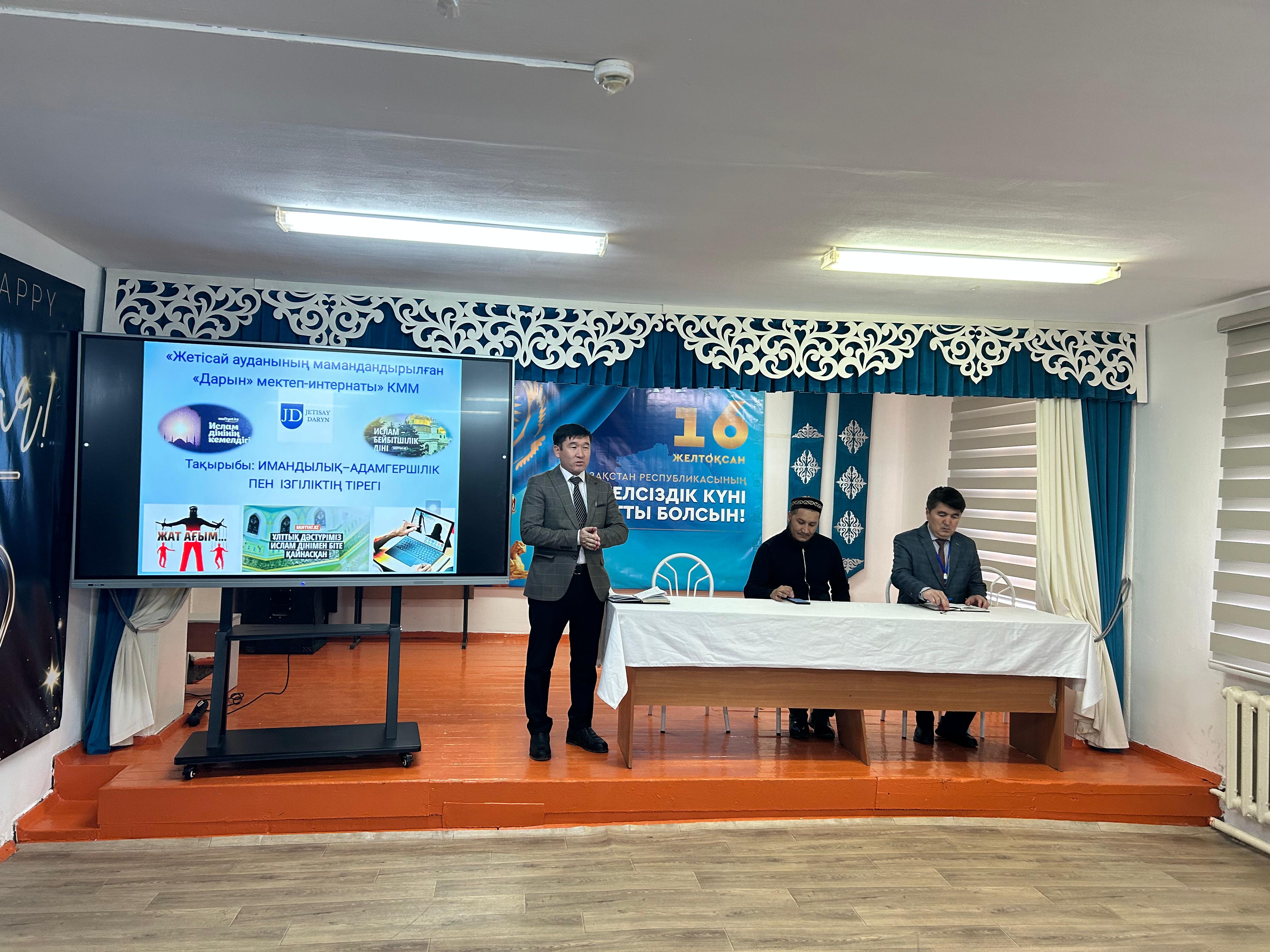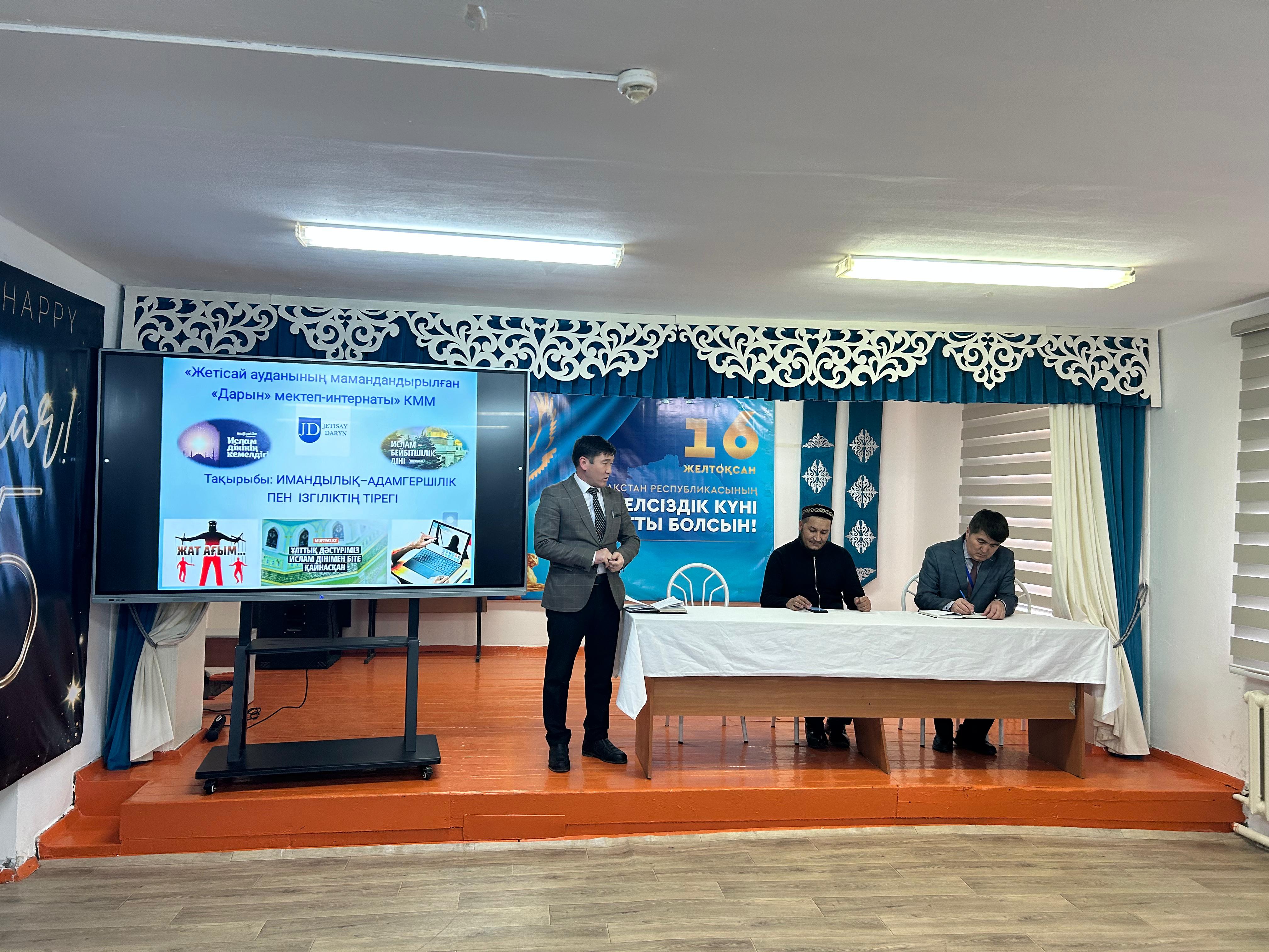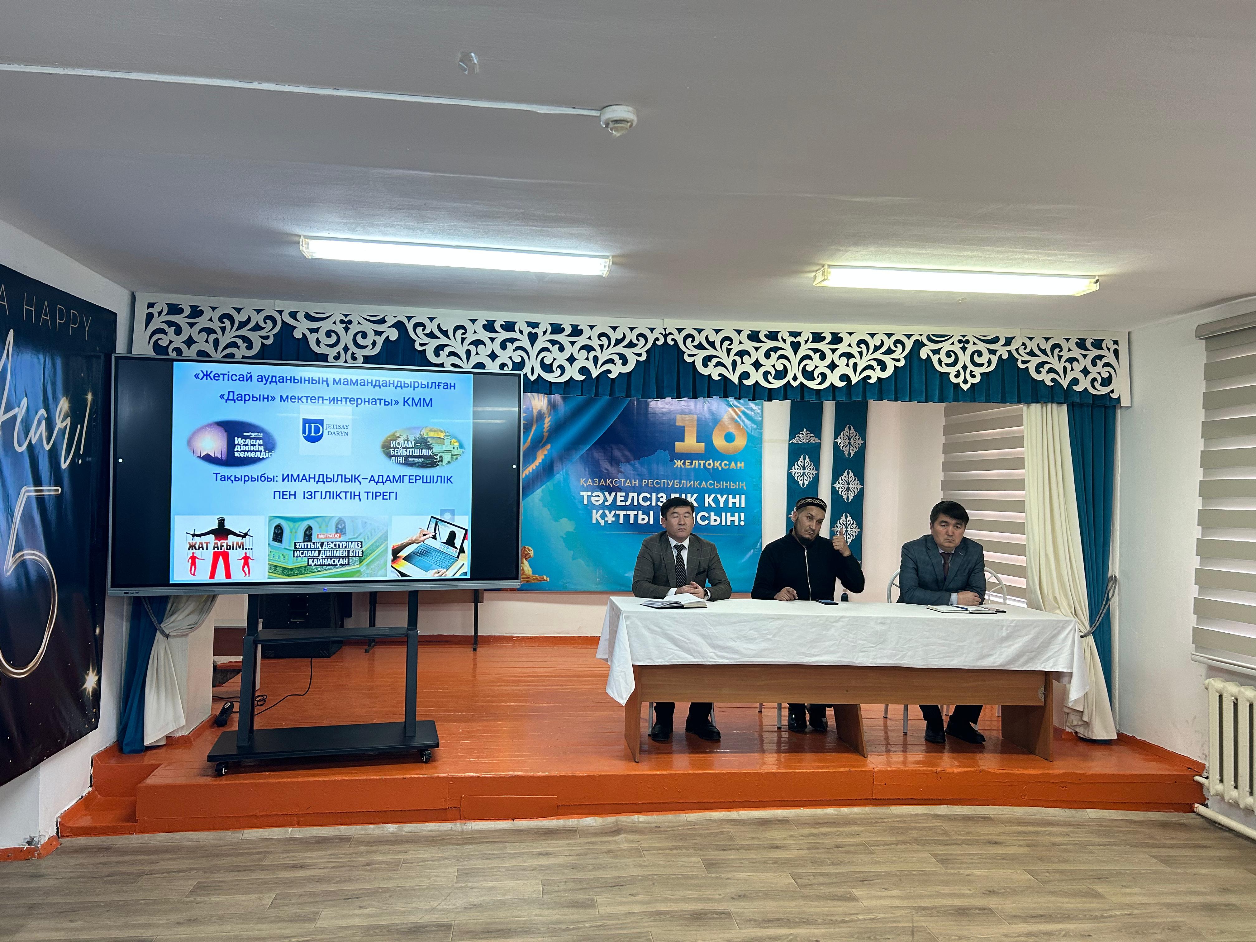 Имандылық – адамзат қоғамының іргетасы, адамгершілік пен ізгіліктің сарқылмас бастауы. Бұл ұғым- адамның ішкі жан дүниесін байытып, оны жақсылыққа, ізгілікке, әділеттілікке ұмтылдыратын рухани құндылық. Имандылық – адамның бойындағы сенімнің, тазалықтың, мейірімділіктің көрінісі. «Жетісай ауданының мамандандырылған «Дарын» мектеп-интернаты» КММ-сінде ДТІЖО Нұрмағанбетов Нұрлыбек Ахметжанұлының ұйымдастыруымен «ИМАНДЫЛЫҚ – АДАМГЕРШІЛІК ПЕН ІЗГІЛІКТІҢ ТІРЕГІ» тақырыбында өкіл имам Тухтаев Умиджан мырзамен кездесу болып өтті. Имамның уағыз-насихатын тыңдап,оқушылар өздерін толғандырып жүрген сауалдарын қойды. Имандылық туралы өрбіген әңгіме барысында өкіл имам оқушыларға мұсылман адамның бойындағы әдептер, ата-ананы сыйлау, Отанды сүю секілді жақсы мінез-құлыққа ие болу жайында айтты.
